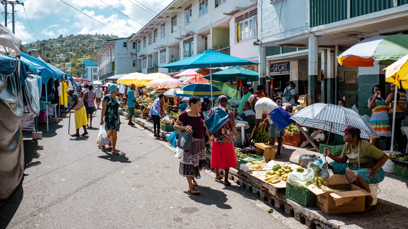 Un marché local à Castries, la capitale de Sainte-Lucie, un État insulaire situé dans la mer des Caraïbes, en avril 2019. © 2019 Fokke Baarssen/Shutterstock