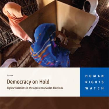 The 32-page report, "Democracy on Hold: Rights Violations in the April 2010 Elections," documents numerous rights violations across Sudan by both northern and southern authorities in the period leading up to, during, and following the April elections. These abuses include restrictions on freedom of speech and assembly, particularly in northern Sudan, and widespread intimidation, arbitrary arrests, and physical violence against monitors and opponents of the incumbent parties by Sudanese security forces across the country. The report is based on research carried out between November 2009 and April 2010 in Khartoum and Southern Sudan.