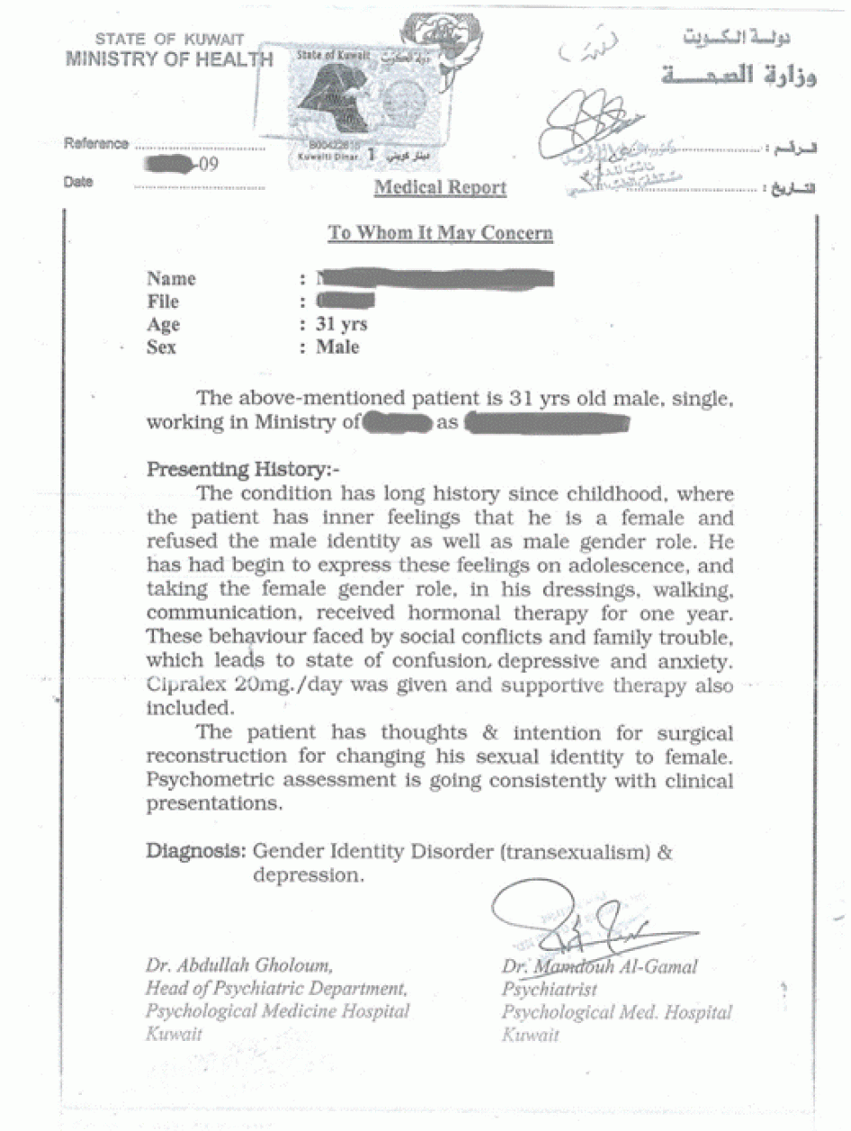 Many health care professionals and Kuwaiti religious leaders suggest that “treatment” and “correction” options for transsexual individuals should aim to restore them to their “natural state.”[8] One psychologist suggested injecting testosterone into male to female transsexuals, forcing them to live as men for a period of time: if that doesn’t work, she said, they might be allowed to transition into women.[9]