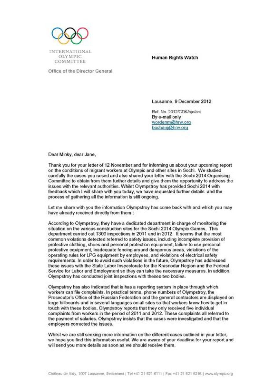 Human Rights Watch repeatedly approached the IOC regarding a number of human rights abuses in Sochi, including abuses against migrant workers. The IOC shared, in at least some cases, this information with the Sochi 2014 Organizing Committee authorities. With respect to the allegations detailed in this report, the IOC responded by citing the information provided to Human Rights Watch by Olympstroy. The IOC also stated that it had contacted the Sochi 2014 Organizing Committee to obtain further details and was seeking more information regarding the different cases concerning abuses against migrant workers in Sochi shared by Human Rights Watch.