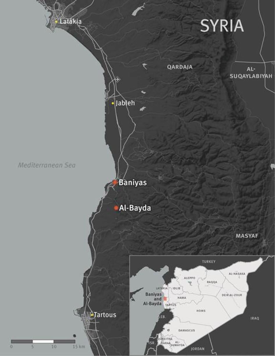 Human Rights Watch interviewed 15 people from al-Bayda and five from Baniyas, between May and July 2013. Ten interviews with witnesses from al-Bayda and five from Baniyas were conducted in person in neighboring countries after they left Syria. The remaining five interviews were conducted on the telephone or through Skype. When possible we provided a map of al-Bayda and Baniyas to interviewees and asked them to identify the exact location of the killings they witnessed.