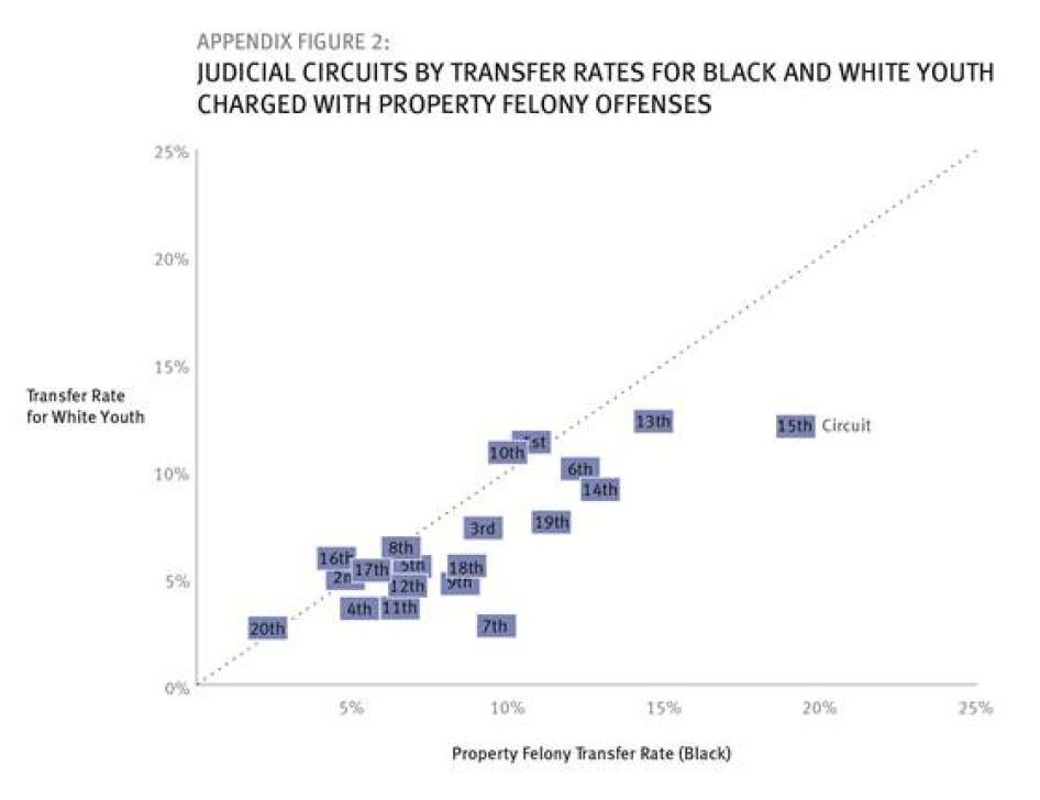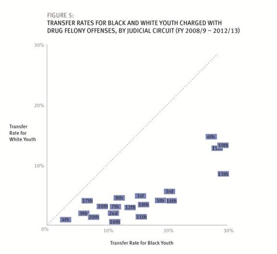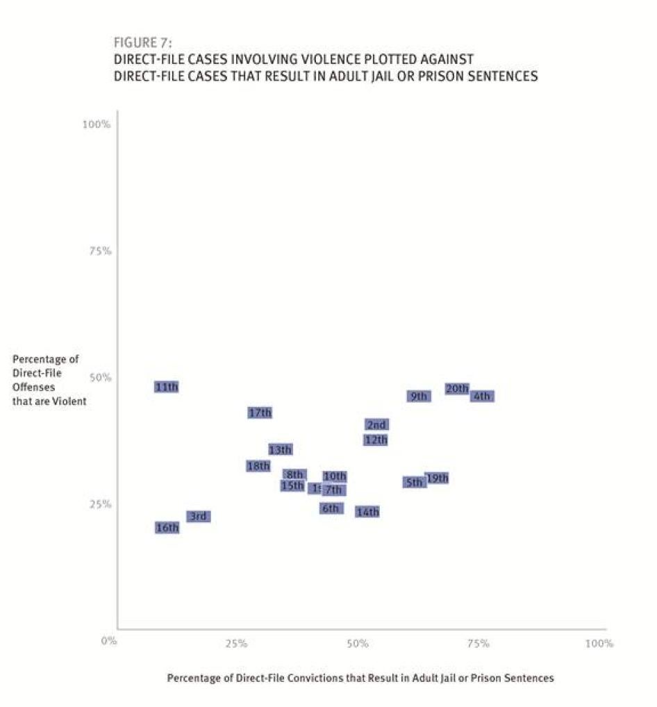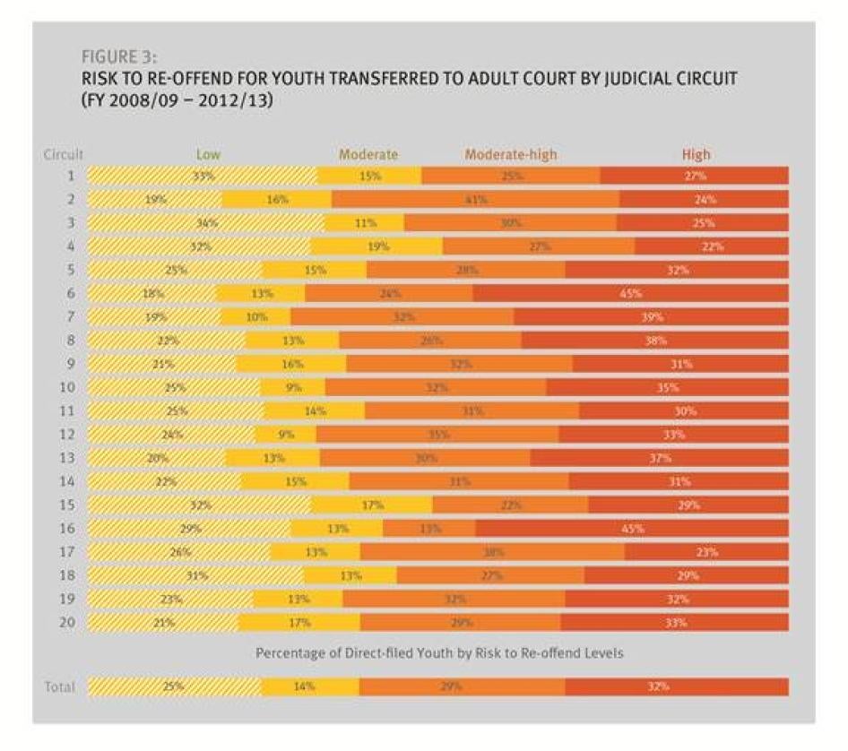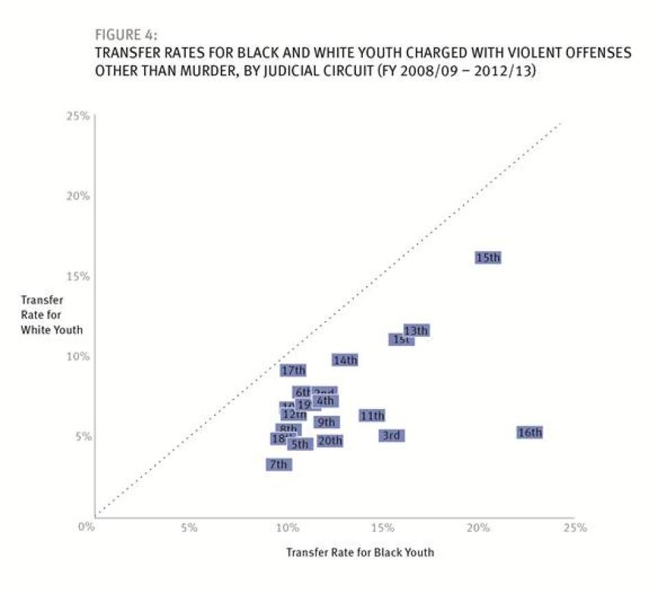 Whether a particular youth accused of a particular crime in Florida ends up in adult court is in an important sense arbitrary. The new data show that nearly 98 percent of the juveniles in adult court in Florida end up there pursuant to the state’s “direct file” statute, which gives prosecutors unfettered discretion to move a wide range of juvenile cases to adult court (including any 16- and 17-year-old accused of a felony), with no involvement by a judge whatsoever. The data show that this discretion is being exercised differently by prosecutors in different judicial circuits within Florida. Too often, as detailed below, the same crime is treated differently depending on the predilections of the prosecutor where the crime occurs: different judicial circuit, different outcome. And there is evidence that racial bias is affecting that exercise of discretion with respect to certain crimes.