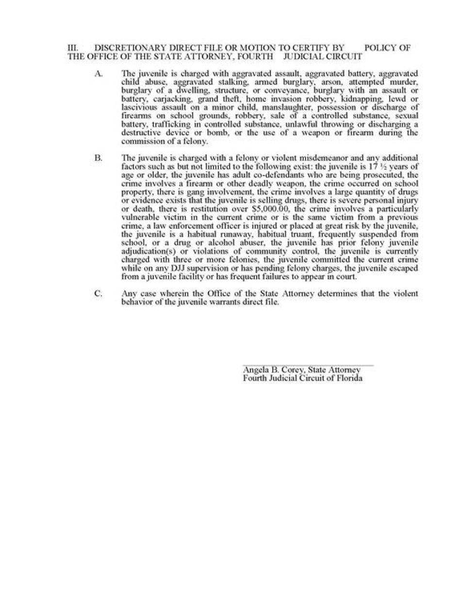 - Until direct file is eliminated, apply the discretion conferred on prosecutors by Florida law to stop the practice of direct file.