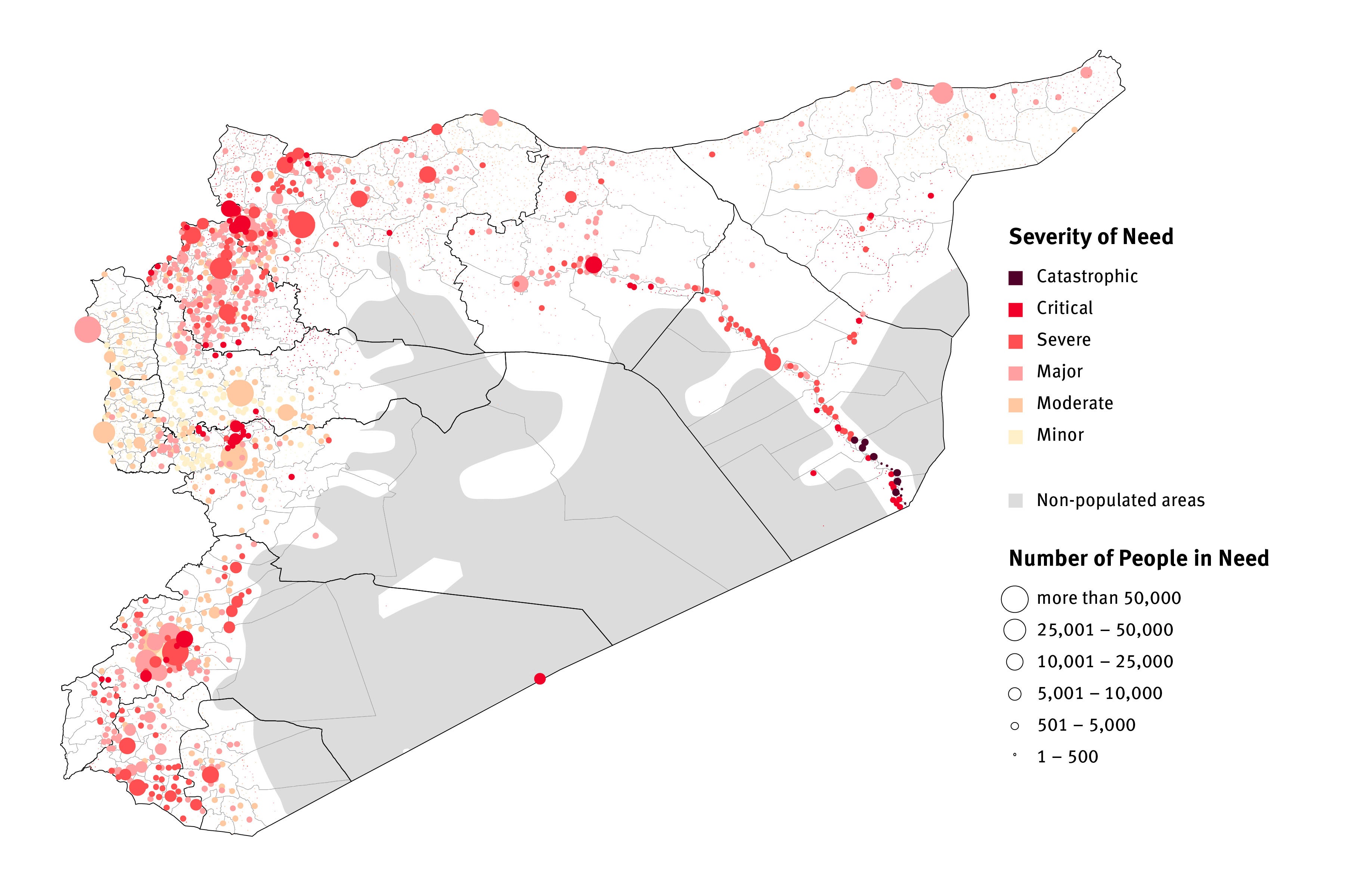Map showing an assessment by the United Nations Office for the Coordination of Humanitarian Affairs of the number of people in need in Syria, and severity of needs, based on data compiled for the 2018 Humanitarian Needs Overview.