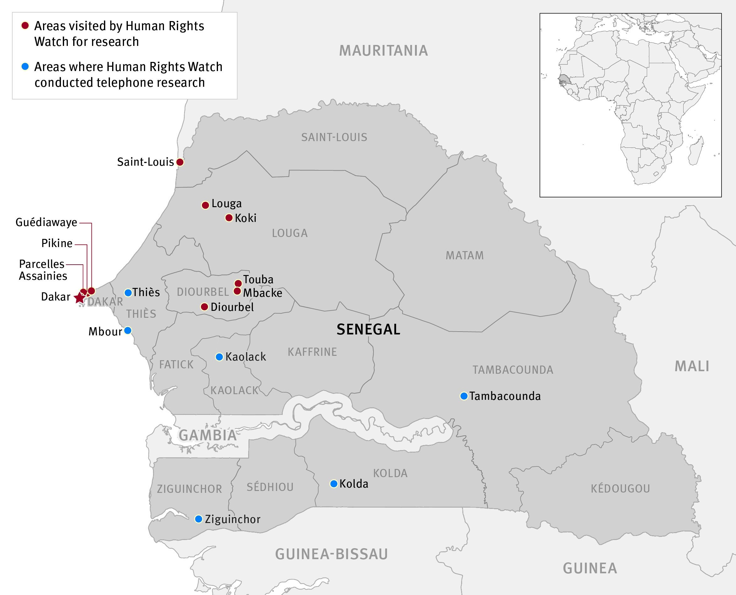 This report, which builds on the findings of six previous Human Rights Watch reports since 2010, is based on a two-week research mission to Senegal’s Dakar, Saint-Louis, and Diourbel regions in June 2018; two months of research in Dakar, Diourbel, Louga and Saint-Louis regions in December 2018 and January 2019; and phone and email interviews conducted between May 2018 and November 2019 with sources in Dakar, Saint-Louis, Diourbel, Louga, Thiès, Tambacounda, Kaolack, Kolda, and Ziguinchor regions. Members of the Plateforme pour la Promotion et la Protection des Droits Humains (PPDH), a Senegalese coalition of rights groups, helped arrange daara visits and facilitated interviews in Diourbel, Louga and Saint-Louis regions.