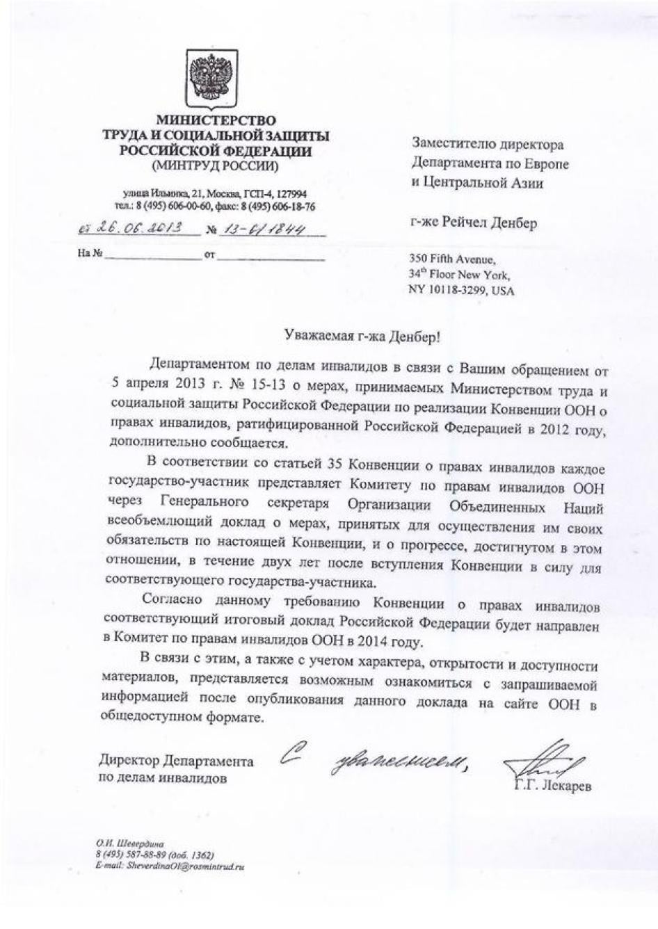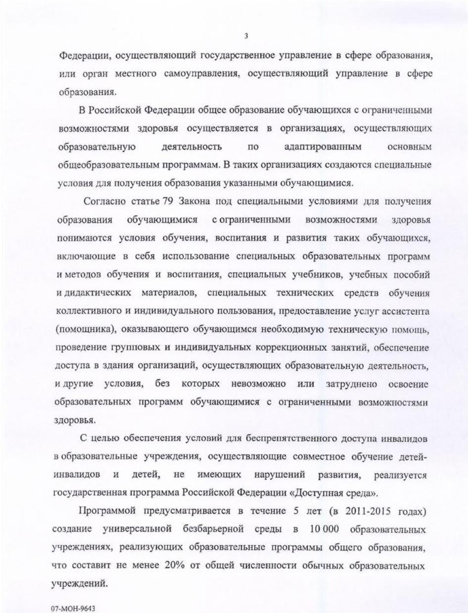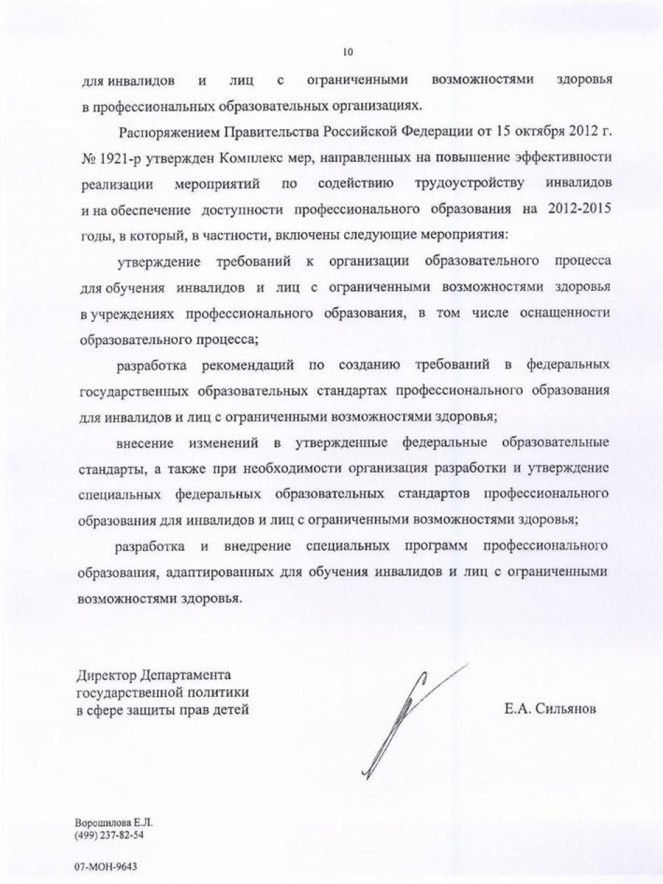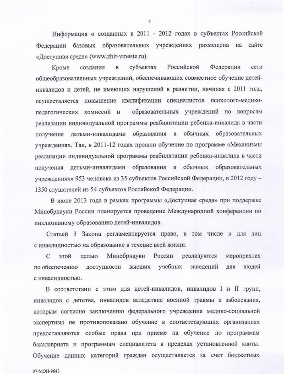 Хьюман Райтс Вотч направляла министерствам образования, культуры, здравоохранения, регионального развития, труда и социальной защиты, связи и транспорта письма с вопросами, изложением выводов доклада и предложением представить их видение ситуации, с тем, чтобы мы могли отразить его в докладе. Ответы были получены от Минкомсвязи (упоминается в тексте доклада), а также от Министерства образования и Министерства труда и социальной защиты. К сожалению, последние два поступили слишком близко к дате публикации, поэтому в самом докладе отражения не получили. Они приводятся в Приложении.