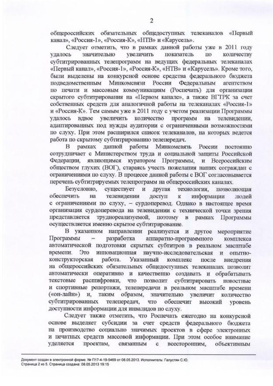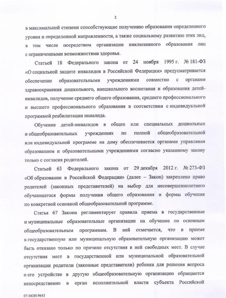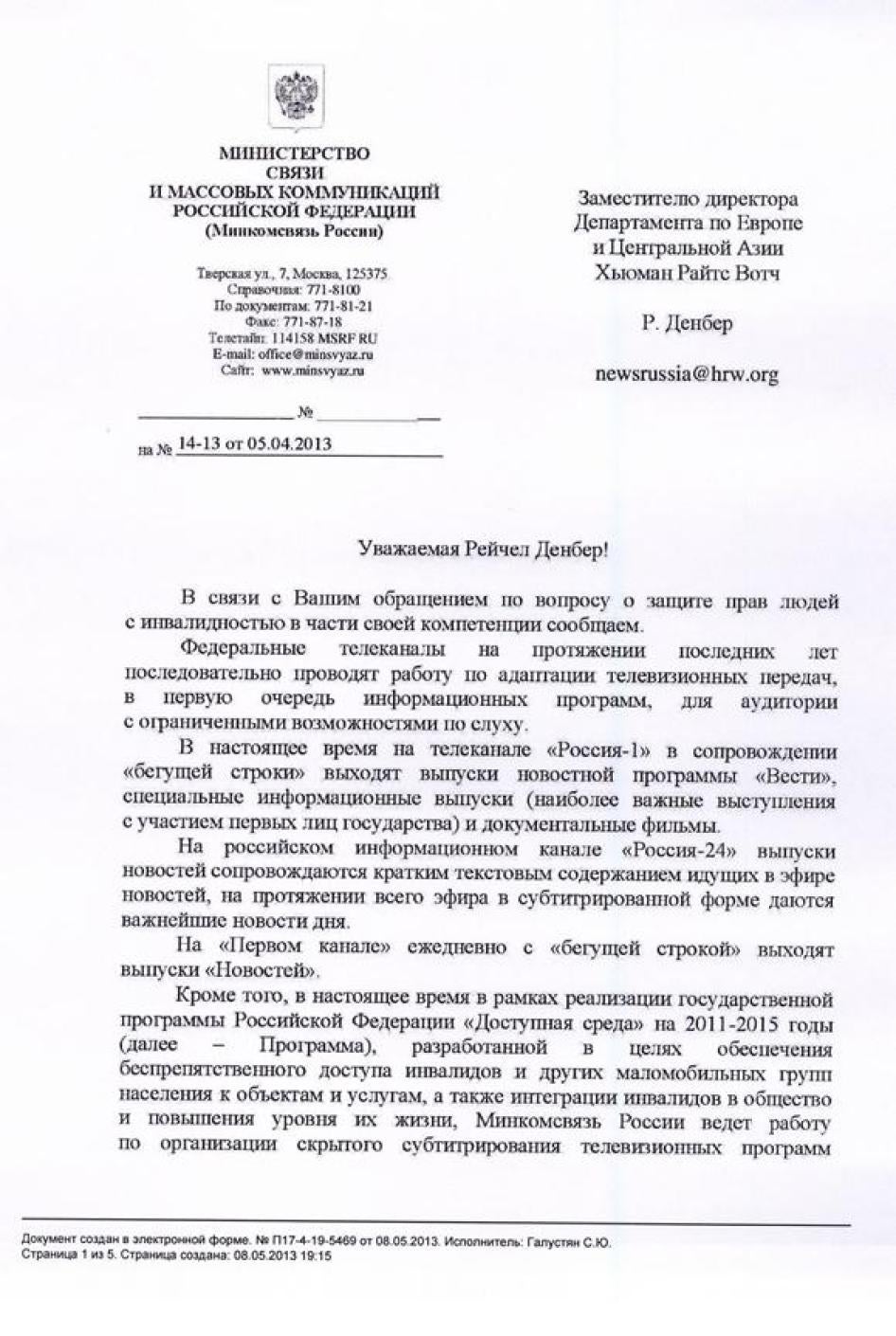 Хьюман Райтс Вотч направляла министерствам образования, культуры, здравоохранения, регионального развития, труда и социальной защиты, связи и транспорта письма с вопросами, изложением выводов доклада и предложением представить их видение ситуации, с тем, чтобы мы могли отразить его в докладе. Ответы были получены от Минкомсвязи (упоминается в тексте доклада), а также от Министерства образования и Министерства труда и социальной защиты. К сожалению, последние два поступили слишком близко к дате публикации, поэтому в самом докладе отражения не получили. Они приводятся в Приложении.