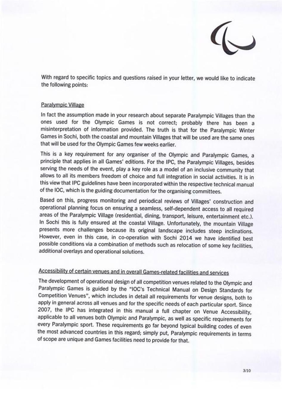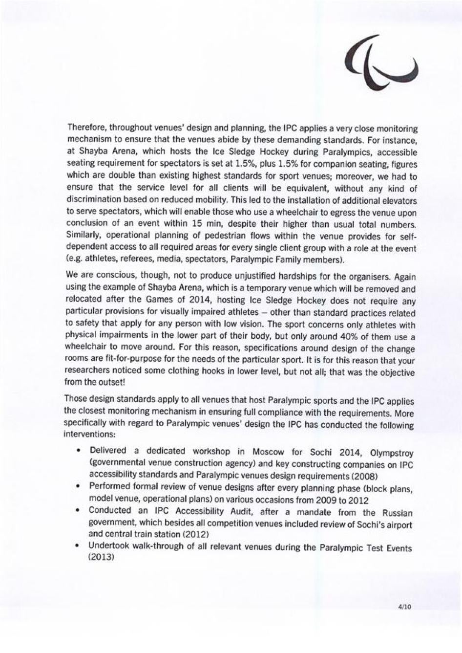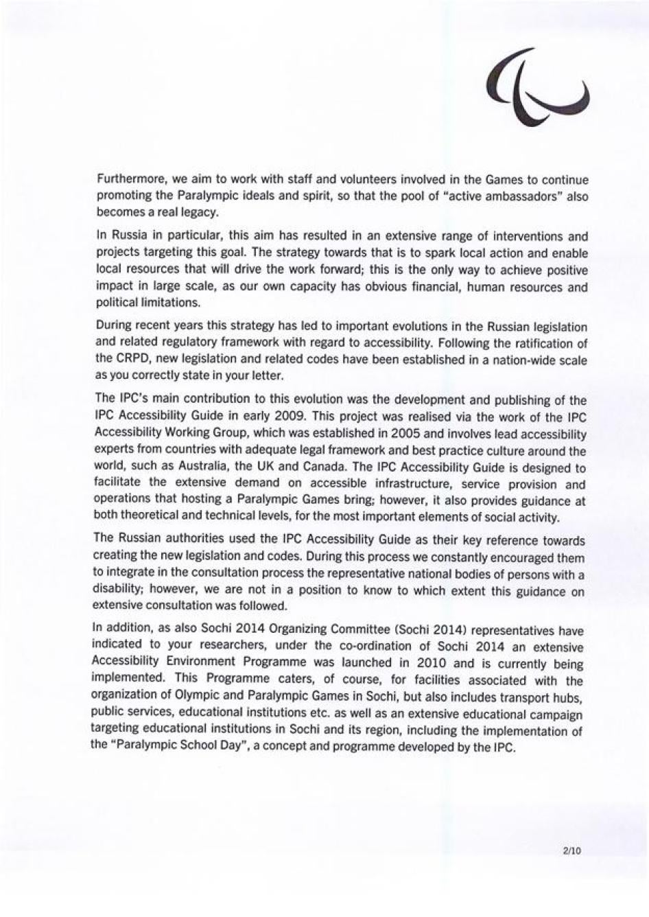 Хьюман Райтс Вотч также направляла Международному паралимпийскому комитету (МПК) письмо с нашими оценками доступности инфраструктуры и услуг в Олимпийском парке Сочи и в самом городе. Нас интересовали характер и степень приверженности МПК обеспечению того, чтобы подготовка Россией к Паралимпиаде соответствовала ее обязательствам в рамках Конвенции о правах инвалидов. Мы получили ответ, он отражен ниже.