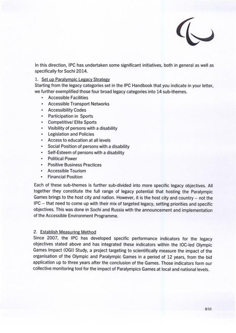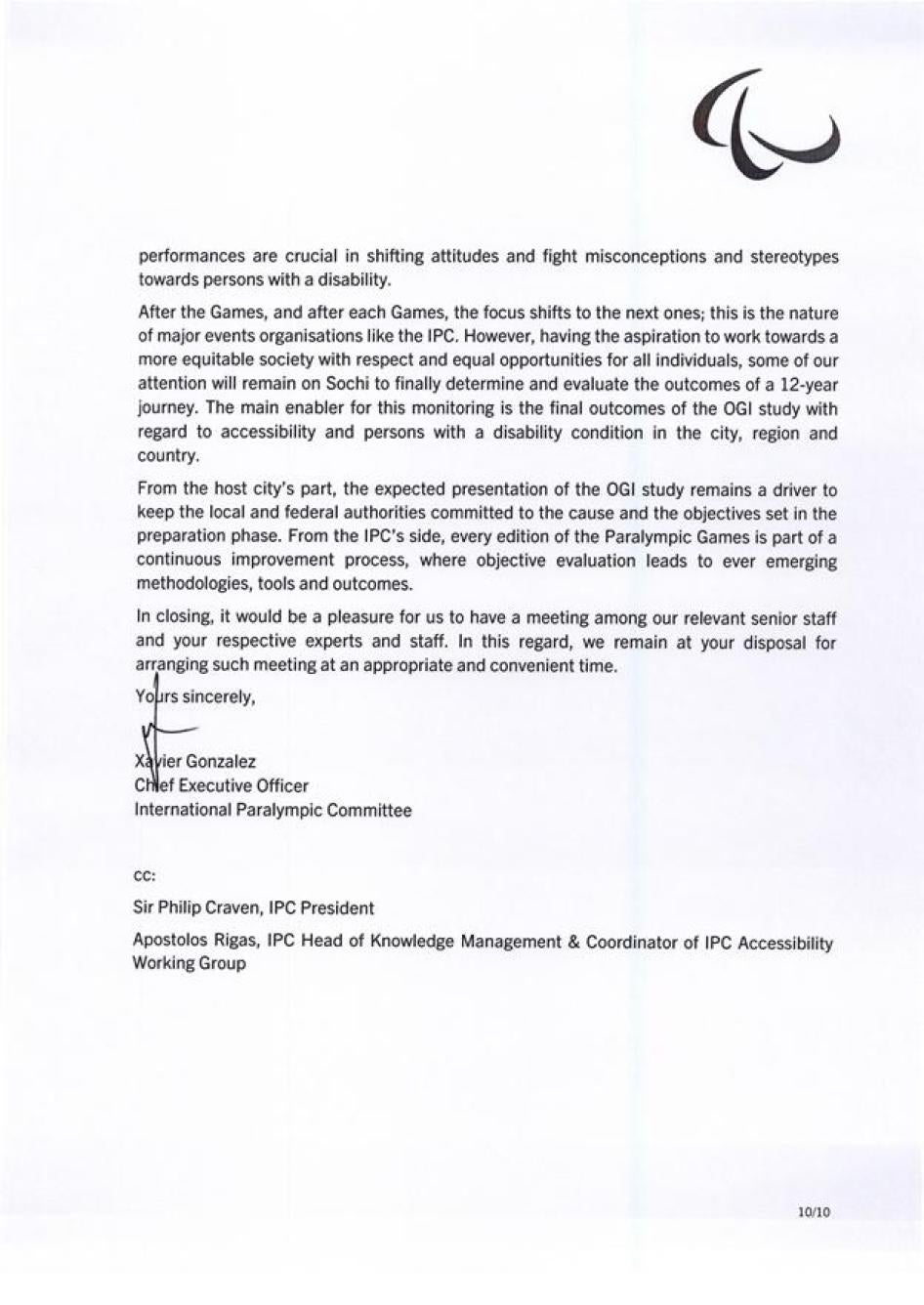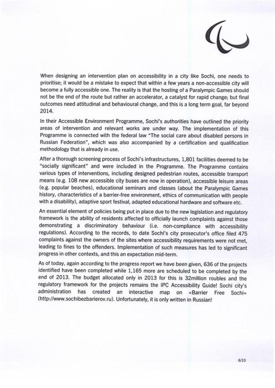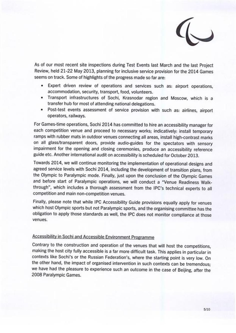 Хьюман Райтс Вотч также направляла Международному паралимпийскому комитету (МПК) письмо с нашими оценками доступности инфраструктуры и услуг в Олимпийском парке Сочи и в самом городе. Нас интересовали характер и степень приверженности МПК обеспечению того, чтобы подготовка Россией к Паралимпиаде соответствовала ее обязательствам в рамках Конвенции о правах инвалидов. Мы получили ответ, он отражен ниже.