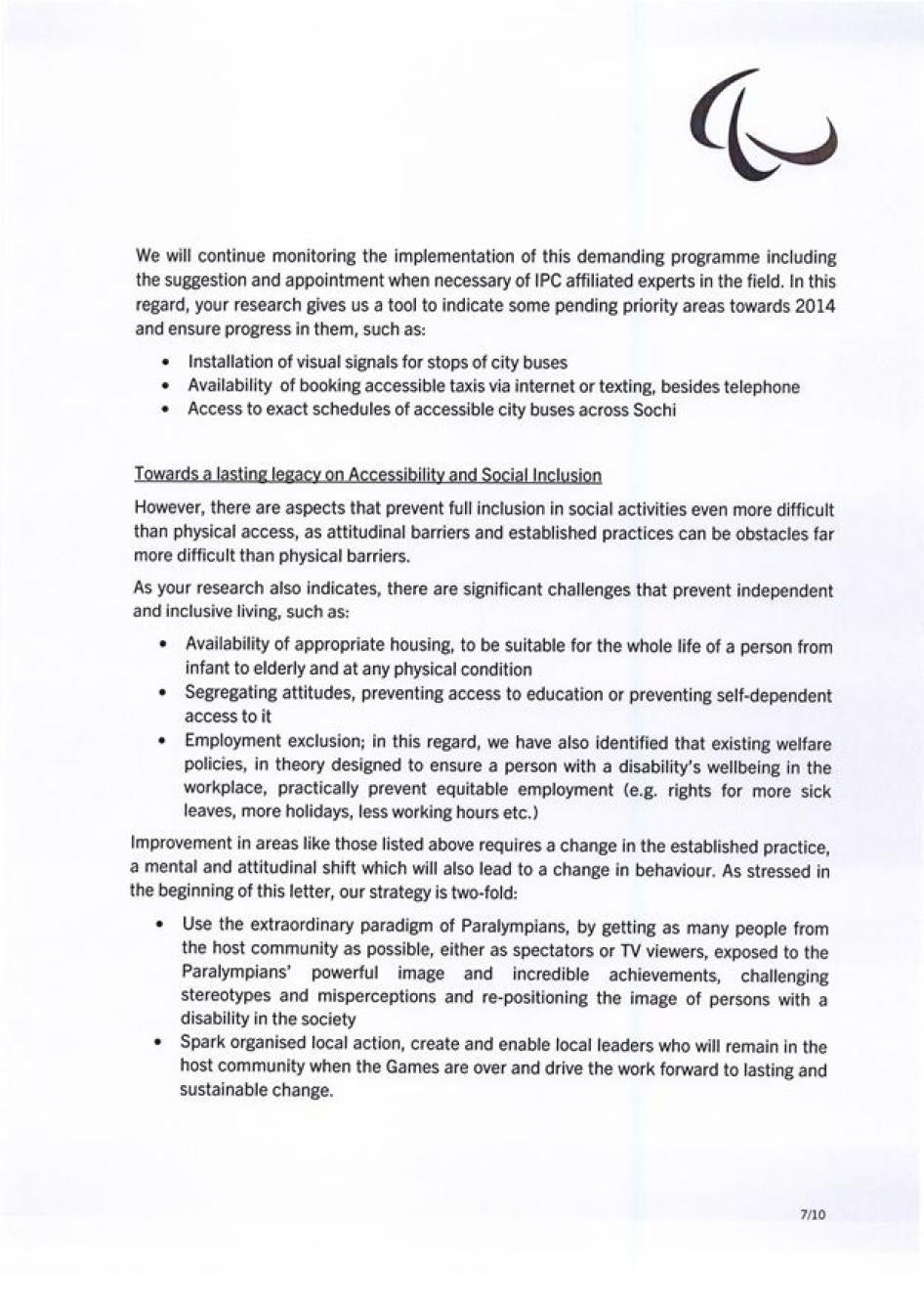 - В ходе инспекционных посещений Сочи и других принимающих городов проводить регулярные встречи с гражданскими организациями и независимыми активистами за права людей с инвалидностью для получения всестороннего представления о выполнении правительством требований МПК в области доступности, в том числе применительно как к организации самих игр, так и к принимающему городу, а также в отношении наследия Паралимпийских игр для принимающего сообщества. Активно учитывать независимую точку зрения при взаимодействии с властями принимающей страны по вопросам реализации требований доступности.