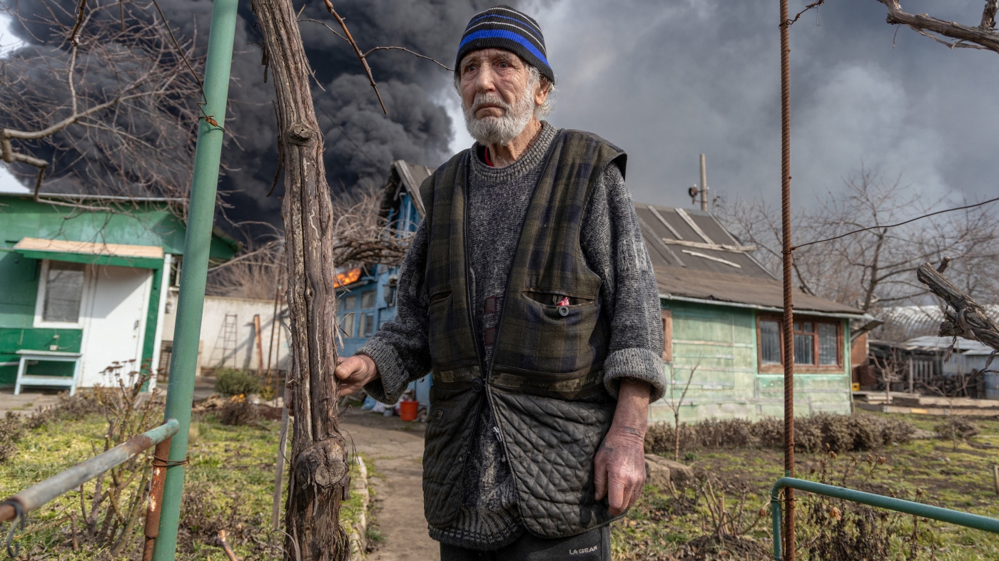 A man stands in the courtyard of his house following a Russian strike on the outskirts of Odesa, Ukraine, March 11, 2025.
